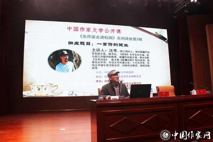 19日上午,沈葦在內蒙古師范大學作題為“一首詩的誕生”的講座。沈葦談到,一首詩的誕生其實是一個秘密,講出來帶有某種冒險性,但文學不是閉門造車,是用來交流、分享,詩歌可以點亮一個人的心靈。結合自己30多年的詩歌創作,沈葦具體分析了《一個地區》《加沙地道》《沙》《兩個故鄉》《開度河畔與一只螞蟻共度一個下午》《樓蘭美女》等詩的誕生機緣和背景。一首詩可以誕生于閱讀,《加沙地道》就是沈葦在讀了美國記者關于加沙地道的報道之后寫下的。而寫于1992年的《開度河畔與一只螞蟻共度一個下午》則誕生于沈葦的某種“無聊”的心緒,他從觀察一只螞蟻開始,逐漸步入更深層次的沉思,最后實現了與螞蟻的平等對話。沈葦總結,一首詩的誕生看似是突如其來的、可遇而不可求的,實際上得益于持久的期待、長久的觀察和沉思,是耐心的產物,本質上是對虛無的反抗。