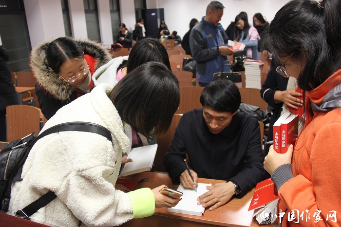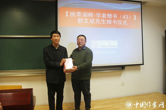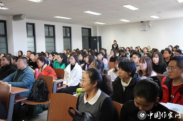 當日下午,郭文斌在內蒙古大學作題為“寫作與生活”的講座。他結合自己的具體創作經歷談到,生活是創作的源泉,要從熟悉的生活里尋找創作資源和素材。1998年是郭文斌創作道路上的一條分水嶺,從癡迷并探索現代小說、先鋒小說的“并不順利”,到回歸“故鄉寫作”的傳統文化領域后找到“敘述的節奏感、愉悅感、狂歡感”,進而開始有意識地寫作“農歷”系列。郭文斌坦言:“熟悉的鄉土、山川、河流激活了我的童年記憶和寫作潛能”。他還結合自己的作品《農歷》《尋找安詳》《醒來》等,從哲學、社會學、心理學等層面解讀“鄉愁”“農歷”“安詳”等意象的現實意義,認為文學作品對于人的心靈具有干預、塑造、滋養的功能,作家的創作不能停留在物質、感官等層面,而是要進一步深入人的情感世界、道德世界,深刻感知、挖掘人的主體性。