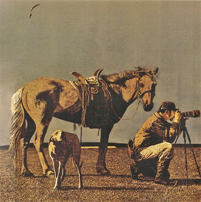 胡日查的套色凸版作品《聽見草原——聚焦》不但為自己涂抹了生命的底色,也開闊了表現的視野。站立的馬,蹲坐的人,嚎叫的狗,盤旋的鷹,構成了草原悠遠的意境。從馬的回首到狗的昂頭,再到人的遠眺,作者巧妙地將視覺焦點轉移至相機的長焦鏡頭上。畫面凝聚了主題,視覺引發著聽覺,濃縮的景象釋放出想象,讓觀者在虛實間徜徉慢步,讓意圖在想象中合成。一列飛馳的機車橫貫大地,正欲破圖而出,所謂“聽見草原”即源于此。大地的離離菒草被覆著陽光的暖意,草原的豐富中又添加了機車的鳴響,視覺與聽覺在敘說著時代的變化,韓愈的詩句“鳴笛急吹爭落日,清歌緩送款行人”正是對應了畫面的意境。