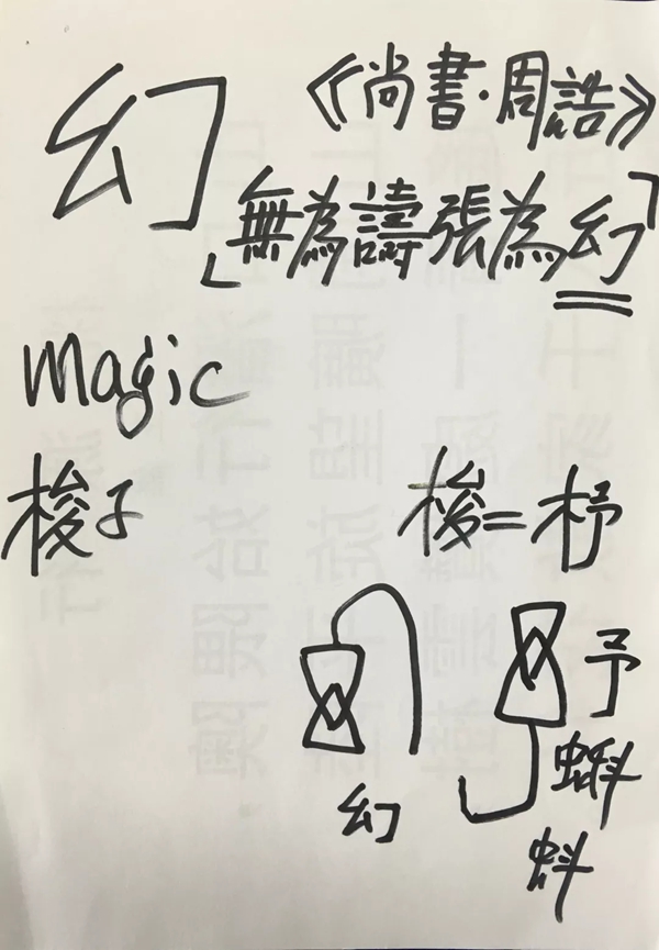 流沙河:“幻”就是變化的意思,變得你完全認不出來了。我來畫給你看。這個字古代就有了。古代見于《尚書》,三千年了。這是原文,周朝政府下的命令,謊言為幻,用來騙人,指的是什么?就是周公那時候,社會上有很多變魔術的人,后來把魔術叫作幻術。周代的人不準許這個,所以這個“幻”字已經非常古老,研究文字發現它是這樣來的。這個字就是“幻”。