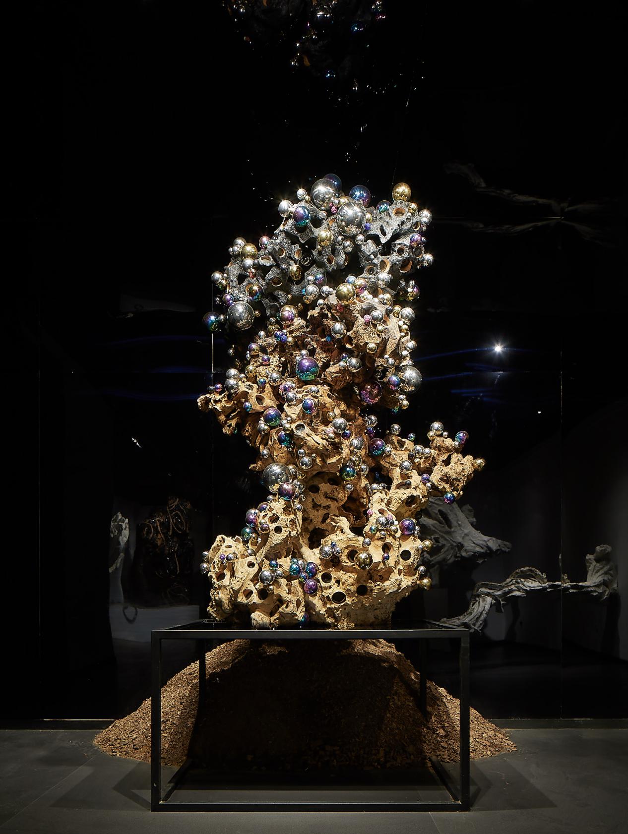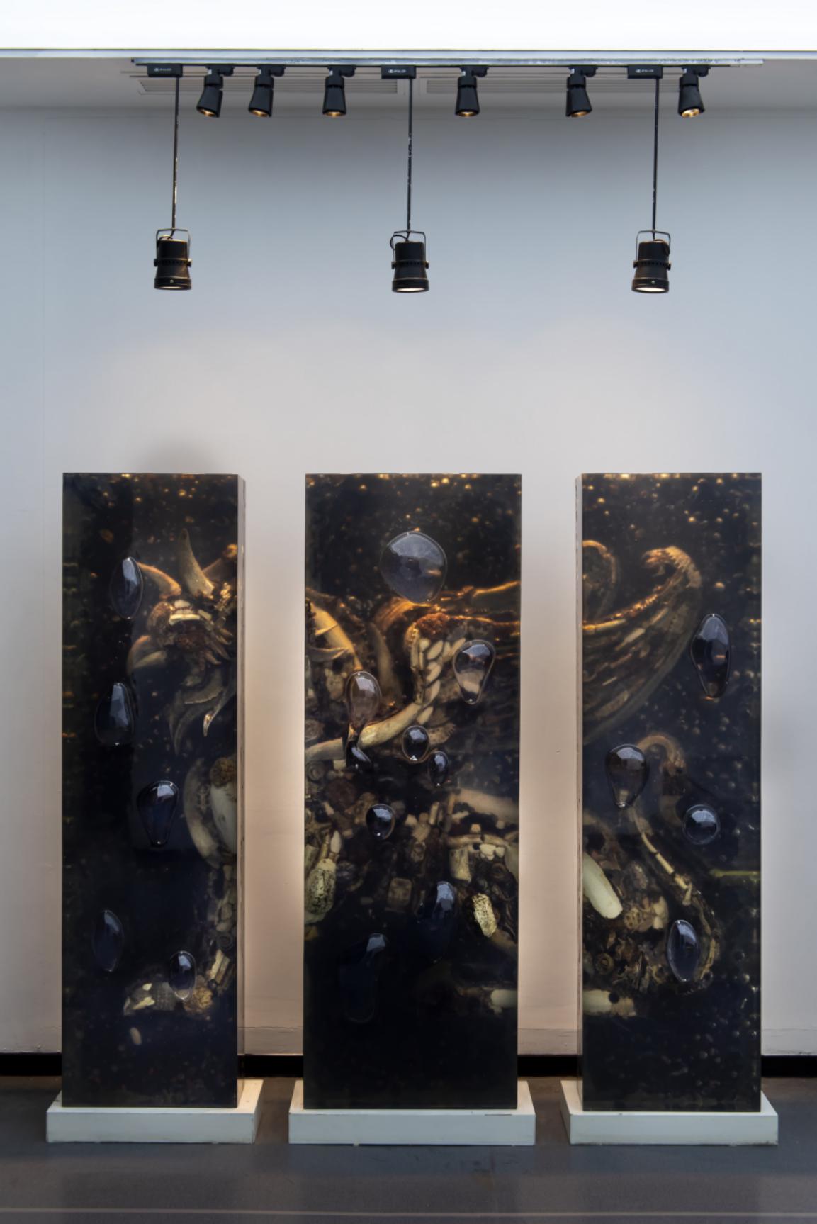 此次展覽立足“大歷史”和“東方精神”,解讀文明演進和傳統文化,最終指向對存在以及未來的思考。展品分為甲骨系列、太湖石系列和中藥系列三個系列,分別從文明的不同層面出發,構建有關文化與自然、過去與未來、生命與死亡的宏大敘事。從代表文明與傳播的甲骨文、紙張,到象征中國格物精神的太湖石,再到中藥和金魚,武寧亞解構了中國傳統文化的肌理,賦予傳統新的精神內涵,嘗試重寫現代精神圖騰。