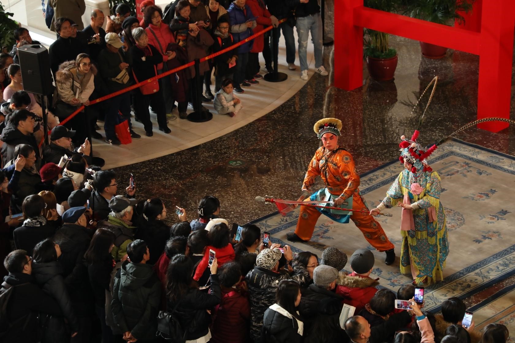 戲劇場入口醒目的“一桌二椅”處,北京風雷京劇團演繹的《拾玉鐲》《扈家莊》《借扇》《貴妃醉酒》《盜御馬》《三岔口》《霸王別姬》等吸引了不少京劇愛好者駐足。