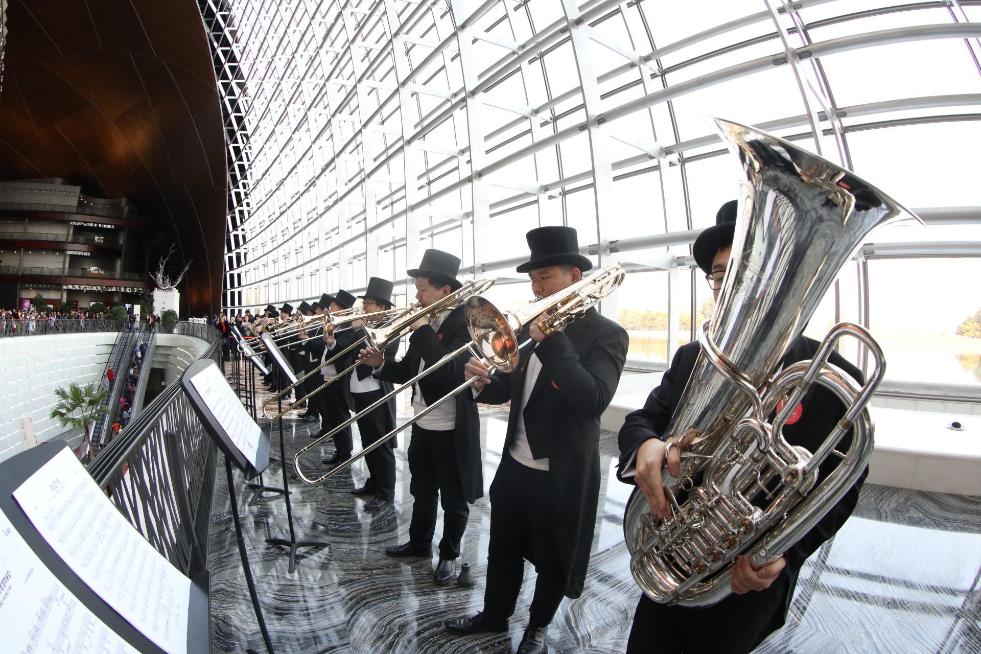 北玻璃幕墻下,國家大劇院管弦樂團通過奏響《節日序曲》《凱旋進行曲》進行整點報時。南玻璃幕墻下,國家大劇院駐院歌劇演員隊則以經典唱段串燒,帶觀眾回憶大劇院制作經典劇目。