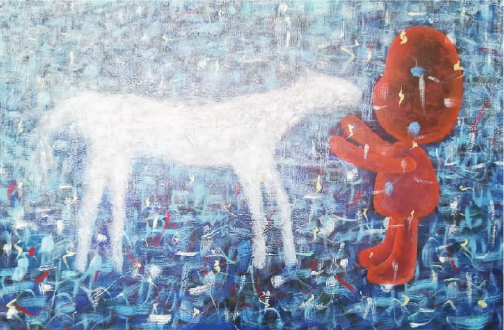 今年恰逢內蒙古首屆國際馬文化博覽會舉辦,內蒙古自治區上下都在為弘揚蒙古馬精神、建設新時代的內蒙古而殫精竭慮,本次展覽正好契合了這個主題。什么是蒙古馬精神?我以為就是自強、樂觀、自由、寬容、腳踏實地、不畏艱苦、團結奮進??v觀展出的作品,我確實感受到了藝術家們對蒙古馬精神的獨到理解和闡釋。形式上,他們不拘泥于馬的具象化表征,摒棄了模式化的創作思維,而更多的是以或抽象、或卡通、或具有符號化的,甚至是變形的方法,表現馬的形態和生命內涵,以及馬所象征的人的精神力量。在藝術手法上他們更是大膽嘗試,不光有油畫、丙烯、水彩、國畫、木刻、雕塑還有銅版畫以及馬克筆繪制的作品。比如金剛的《鞍馬史詩》 ,用舊馬車的轅木、舊馬鞍和馬飾以及廢棄的門板組合成馬的幾何形狀,給人一種古樸的空間感和時間感。吳智彬的《浮城》則以馬克筆細密的筆觸描繪了一個既逼真又幻象的超現實世界。蘇德巴特爾的油畫《戰神》將傳統裝飾與現代卡通融為一體,描摹了以長生天和戰馬為核心的蒙古精神,極具想象力。青格爾的油畫《蒙古臉譜》給我印象尤為深刻,他以仿蒙古族傳統皮雕的形式,將漫畫和裝飾畫的筆法融入他的構圖,那一個個擠壓在似煙囪和管道中的臉,隱喻了現代性與游牧文明的沖撞和融合。展覽策展人莫尼的作品也給人與眾不同的感受,他的油畫《沉默的他們》系列作品將代表草原游牧精神的馬與當代社會的眾聲喧嘩進行比照,使沉默產生了形而上的寓意。而另一位策展人朝魯的油畫《騎士》 ,則借鑒了古代壁畫和巖畫的形態,粗糲而富有歷史氣息。孫玉寶的《冬牧》以現代水墨的手法,表現了在嚴酷的自然環境中牧人與馬的依存關系。而錢達木尼的丙烯《尋· 3》中的馬被賦予了蒙古族人崇尚的藍色,將馬的姿態、節奏與大自然的絢爛融為一體,具有很強的表現主義風格。靳雙雙的油畫《花花世界的幻想》則是一個“90后”城市女孩對馬和牛的奇妙的想象,畫面清新、淡雅,有水彩般的透明感。此外,油畫或丙烯類還有芬筍得日的《無聲的自述》 、李旭東的《晨曲》 、旭日花的《草原印象》 、白嘎力的《浮影》 、孟和琪琪格的《靜謐》 、蘇龍嘎的《夢》 、旭日嘎的《15℃》以及段琦琦的《同在》 ;國畫有海日汗的《天靈》 、敖寶林的《鬃飛》 、孟和烏力吉的《藍騎士》 ;雕塑有薩其日拉圖的《牧馬人系列:初戀》 、高貝的《敕勒川印象》 、岳布仁的《草原戀》 ;水彩有那日蘇的《風馬》 ;版畫有伊蘭納的A t T h a t M o m e n t等,這次展覽既以“80后” “90后”為主體,又以上世紀五六七十年代出生的藝術家為先導,形式多種多樣,內容豐富多彩,受到社會各界的關注和好評。