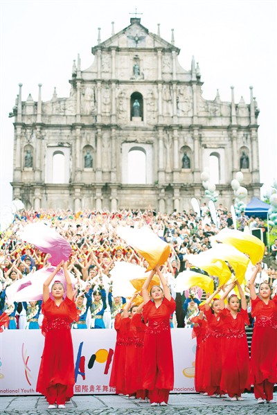 演員在澳門大三巴牌坊前進行澳門國際青年舞蹈節巡游表演。新華社記者 張金加攝