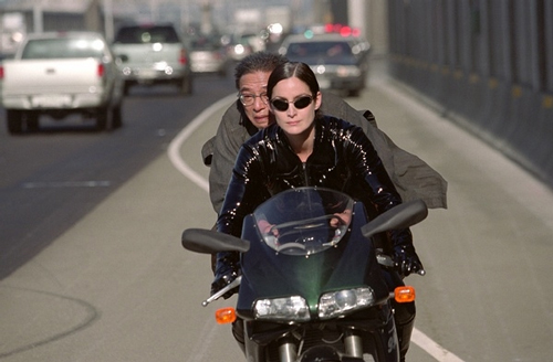 縱觀世界科幻電影史,“崔妮蒂駕駛摩托車”這一意象可謂影響深遠。許多影視作品,都會借助這種方式來塑造獨立、堅韌、帥氣的女性形象。譬如,在諾蘭導演的《蝙蝠俠:黑暗騎士崛起》(2012)中,安妮?海瑟薇飾演的貓女,一身緊身黑衣加摩托車的形象,幾乎是崔妮蒂的再現。由蓋爾?加朵飾演的吉澤爾,在《速度與激情4》中初登場時,也是騎著摩托車帥氣登場,成為一群駕駛汽車的男性角色中的特殊存在。甚至跨界到日本動畫電影界,例如《名偵探柯南》系列中,黑衣組織里的貝爾摩德、雪莉等女性成員,駕駛哈雷摩托車的鏡頭也多次出現?!芭浴薄昂谝隆薄澳ν熊嚒钡?,都帶有《黑客帝國》中崔妮蒂的影子?!按弈莸佟边@一人物最終突破了科幻電影的局限,成為一個永恒的經典銀幕形象。