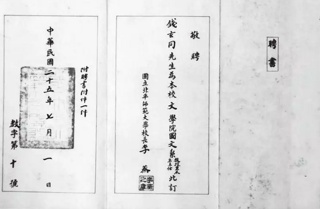 國立北平師范大學文學院國文系給錢玄同的聘書