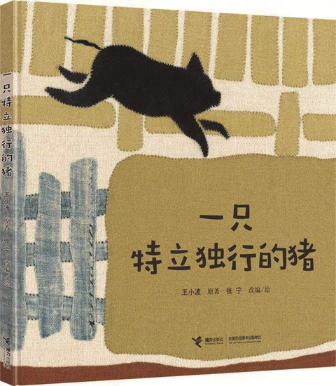 圖畫書《一只特立獨行的豬》則又是另一種“共生演化”,原文本是王小波的同名雜文,其文其意可能均非為兒童所能理解。但張寧對原著進行了視角轉換、抽離復雜時代背景、增添小豬成長細節和兒童見證者等一系列大刀闊斧的改編,從而實現了成人文學的兒童化。這種兒童化絕非幼稚化,因為原著中自由、自強和獨立的精神內核被完整地保留了下來。為了表現原著內蘊的精神力量,張寧采用“剪布法”并借鑒古樸的漢畫風格來鋪展故事。布藝拼貼畫面所呈現的強烈肌理質感與質樸、溫暖的氣息和原著所要傳遞的精神有著高度的匹配性。最終,這本圖畫書延展出文字的觸須所無法抵達的另一層表意空間,完成了一種智性精神的代際傳遞與演化。