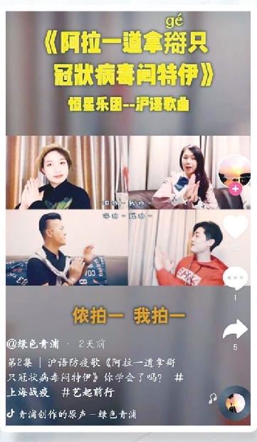 本地話是最容易走通人心的語言。在金山,歡笑主播以當地話搭配手語,用金山區居民最親切的語言為防疫抗疫工作鼓勁。在青浦,恒星樂團的幾位年輕人創作了一支滬語歌曲《阿拉一道拿搿只冠狀病毒悶特伊》,亦莊亦諧的氛圍下,道出全民參與疫情防控的心聲與要點。王淵超已是滬上頗有名氣的音樂人,近年來,他原創的滬語歌曲在全年齡段市民里傳唱甚廣。