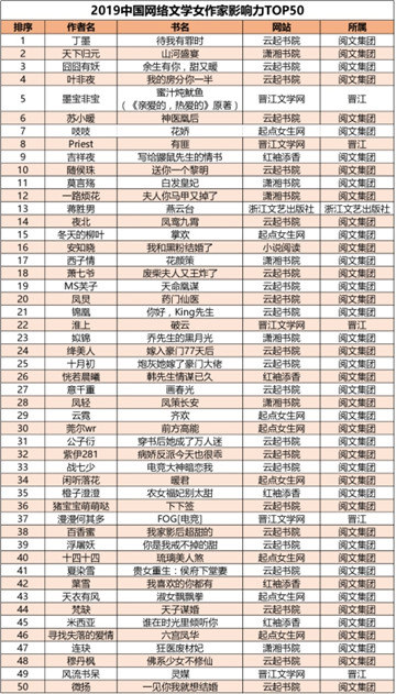 數據來源:速途研究院“2019原創文學白金作家及大神作家”榜單