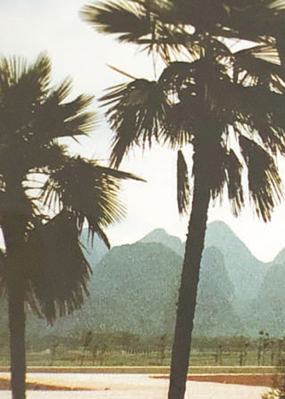 霍克尼筆下,以北京和桂林風景為主題的作品居多。事實上,一到桂林,他便被眼前的景色深深吸引,立刻開始以群山為主題作畫。書中記錄道:“從下飛機的那一刻我們就意識到,這里的奇異景致比我們想象的還要不凡、讓人激動。我們曾看過一些描繪桂林陡峭山水的畫作,當時我們以為這些神奇的景觀不可能是真的?!彼麄冺樌旖舜?,對沿途風景留戀不已?;艨四崤e起相機不停地拍照,可兩岸的景色也不斷地變換,“在這里,自然景觀變成了視覺的樂章”。