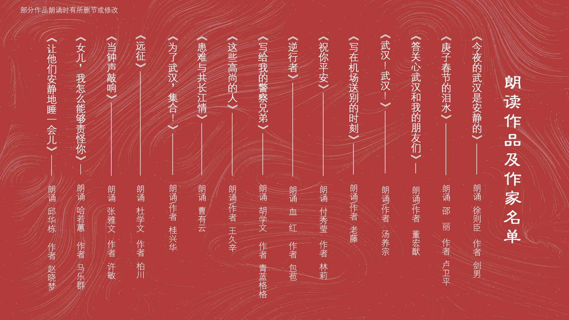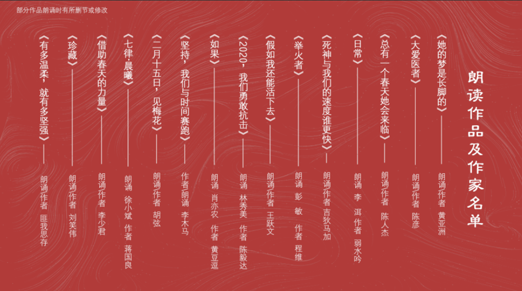 3月10日起,由中國作家協會精心策劃、組織的“同舟共濟 同心戰‘疫’”主題作品線上誦讀會在中國作家網、人民網、新華網等網絡平臺陸續播出。誦讀會由“疫情來襲”“緊急馳援”“大愛逆行”“智慧勇氣”“信心希望”五個篇章組成,邀請來自全國各地的30位詩人、作家誦讀疫情防控以來涌現出來的文學作品,傳遞文學力量,表達人民心聲。吉狄馬加、邱華棟、王躍文、陳彥、李洱、徐則臣、徐小斌、董宏猷、匪我思存、邵麗、杜學文、老藤、李少君、王久辛、黃亞洲、胡弦、湯養宗、曹有云、張雅文、彭敏、哈若蕙、胡學文、血紅、付秀瑩、肖亦農、桂興華、陳人杰、劉笑偉、林秀美、李木馬等傾情誦讀。朗誦會視頻由中國作家出版集團承制。