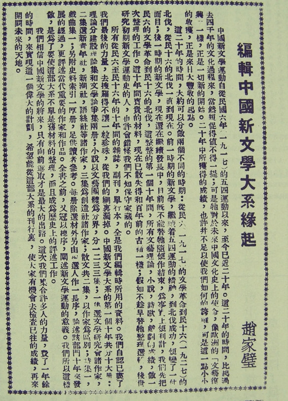 1935年3月15日刊行的《良友畫報》第103期上,有《中國新文學大系》系列廣告,其中包括趙家璧的《編輯中國新文學大系緣起》:“我們相信中國新文學的將來,只有向前進取才是最大的出路。這次我們集合許多人的力量,費了一年余的時間,來實現這一個偉大的計劃,希望能從這部大系的刊行里,使大家有機會去檢查已往的成績,再來開辟未來的天地?!边@“許多人的力量”,落實在趙家璧所撰《<中國新文學大系>前言》,便是: