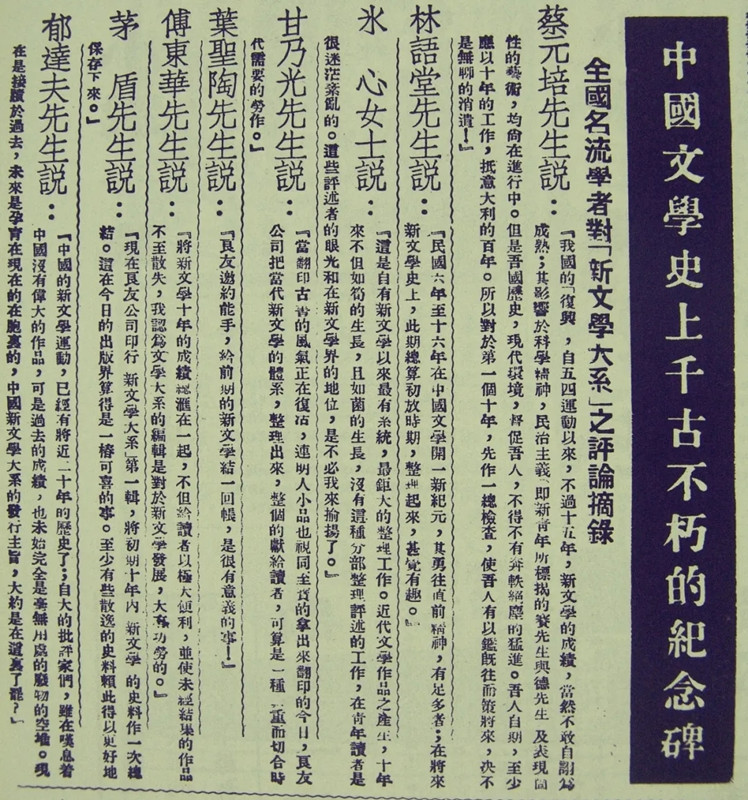 《良友畫報》第103期“全國名流學者對《新文學大系》之評論摘錄”