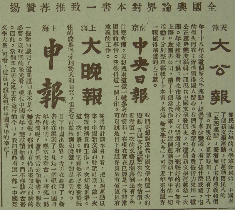 冰心女士說:“這是自有新文學以來最有系統,最鉅大的整理工作。近代文學作品之產生,十年來不但如筍的生長,且如菌的生長,沒有這種分部整理評述的工作,在青年讀者是很迷茫紊亂的。這些評述者的眼光和在新文學界的地位,是不必我來揄揚了?!?/span>