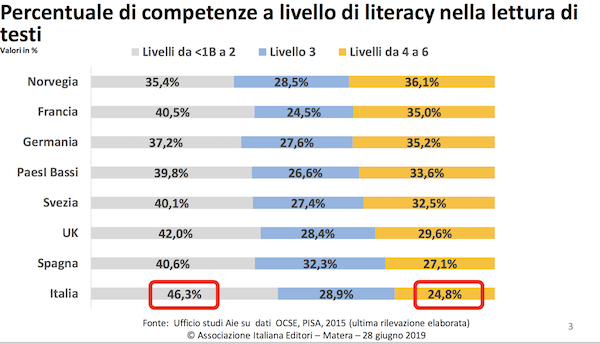 2019年,意大利出版商協會成立150周年。7月28日,協會主席Ricardo Franco Levi發表講話,題為“意大利出版社現狀、讀者情況、銷售情況以及新的電子化領域”(若無特別指出,以下數據皆來自于該文件)。講話的開頭便援引了經濟合作與開發組織的2015年PISA項目數據。