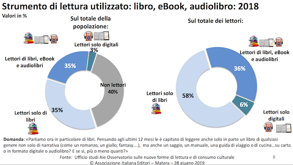 意大利的出版商會出書,也會賣書,這一點從它們積極參與建設網上書店便可以看出。同時,它們也重視讀者。意大利出版商協會的報告以PISA項目開篇,來引出他們對讀者情況的調查。以下是出版商協會給出的2018年與2019年14到75歲意大利人的閱讀情況:
