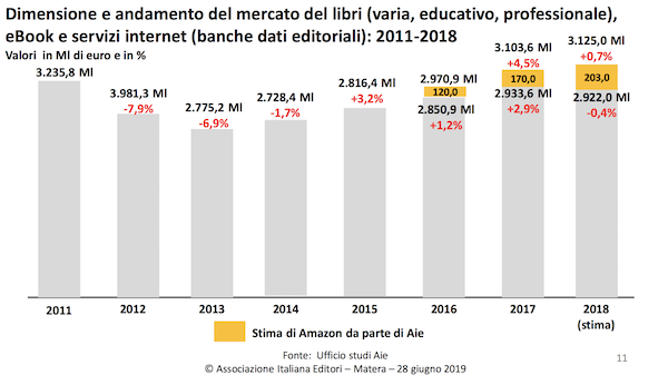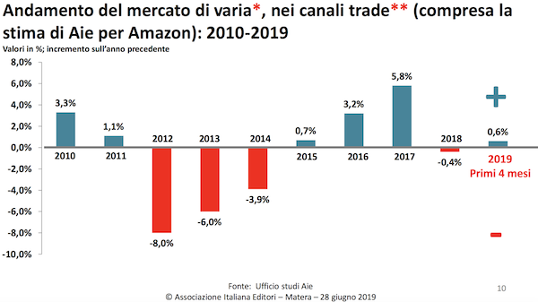 就圖書市場而言,除去教材等專業型書籍,意大利出版商協會給出了2010年至2019年十年間的銷量數據,同時算上了估算的亞馬遜數據: