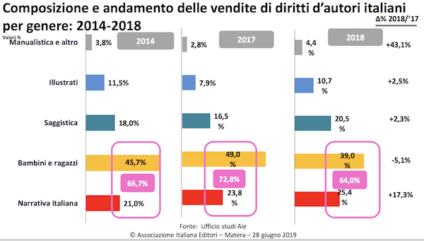 而就版權銷售而言,意大利圖書市場也有增幅,主要是兒童圖書以及敘事文學類,其在整個版權市場中所占比例,在2018年達到了64%。