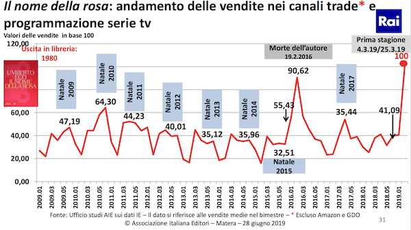 意大利出版社協會的數據是多方位的,有意思的是,協會還列出了書籍周邊市場。比如,以翁貝托·??频拿睹倒宓拿帧罚ɑ蜃g《玫瑰之名》)而言,協會給出了該書從2009年至2019年3月的銷售波動數據,以2019年3月的銷量為基準值100: