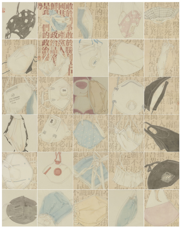 而在藝術創作中,一些同一主題的小幅作品也常??梢詷嫵纱蟮膭撟?。其中年輕畫家徐旭峰的作品《同舟共濟》就屬于這一類型,作者以30件小作品,呈現了三十只口罩的日常狀態,他的創作靈感來自朋友們每天使用的不同類型的口罩,而背景的字則主要來自各方的寄語。