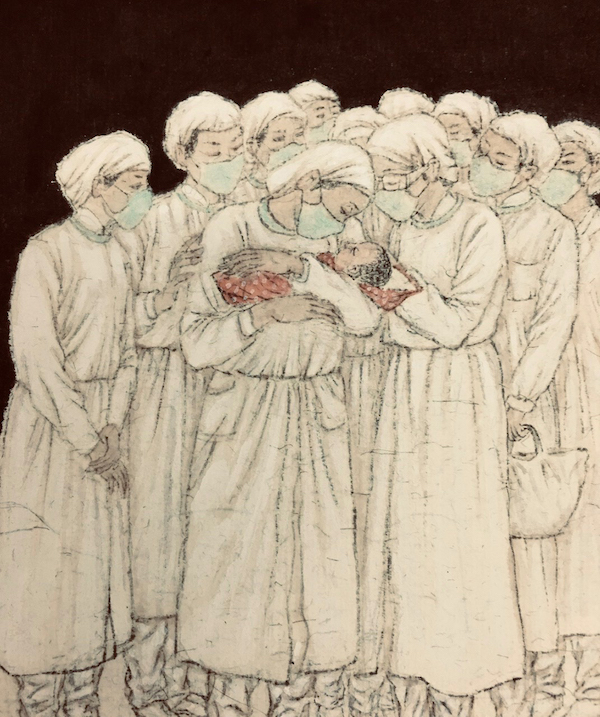 在此次疫情期間,也涌現出大量醫護人員題材的作品。如何畫出自己的語言,畫出自己的真誠對藝術家來說并不容易,但老藝術家的作品或許有些啟發,70多歲的藝術家陳家泠每日觀看新聞,了解前方動態,他通過中國畫的方式結合電腦合成,跨界創作。盡管在層層包裹的防護服內,但畫面中醫生溫柔的眼神帶給病人最大的安慰和信心。油畫家邱瑞敏在面部只露出雙眼的情況下,將畫面的重點放在醫護人員防護服的處理上,用筆概括果斷,用色大膽,帶著一種果斷、堅決和責任。