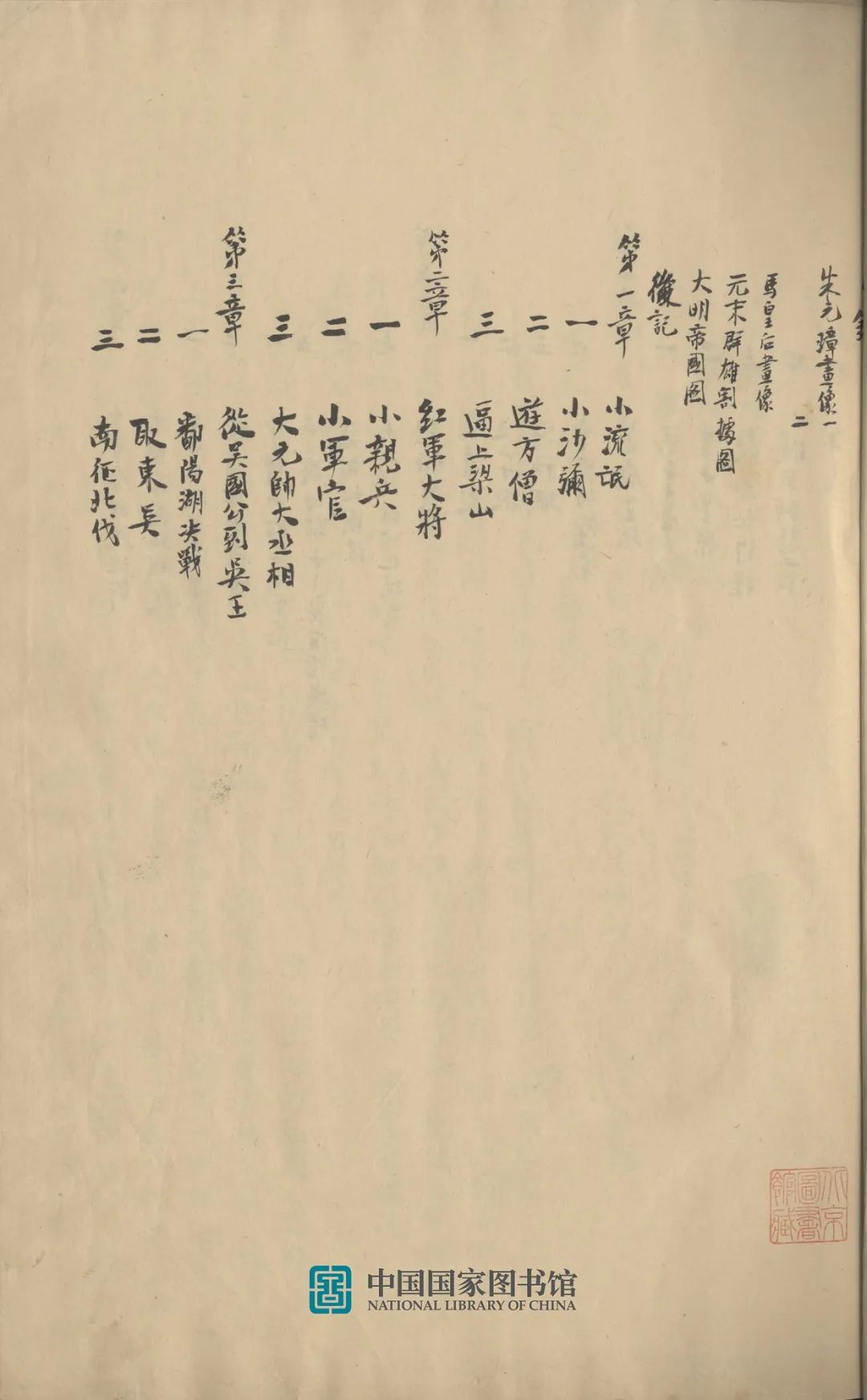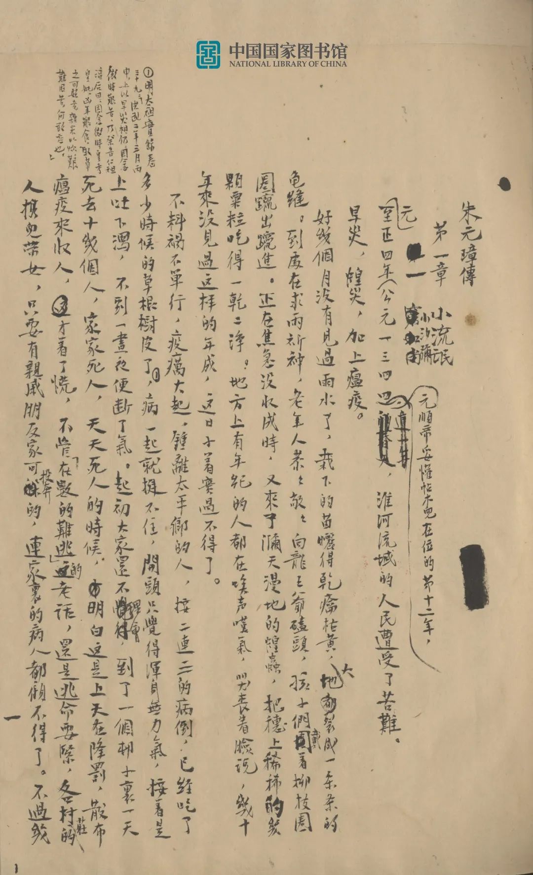 國家圖書館收藏的《朱元璋傳》手稿,是1948年寫成的版本,1954年吳晗任北京市副市長時親自捐贈。該手稿為毛筆手書,封面、目錄、封底、后記5頁,正文136頁,共計141頁,分四冊線裝,正文有較多修改。稿件封底有幾行鋼筆草書,字跡潦草,大意是:一,彭瑩玉的下落是消極的、道家的,稱贊不當;二,國家機器由軍隊、法庭、特務機構等組成,而不是由官僚機構和軍隊組成;三,朱元璋由農民階級轉變為地主階級,不是由個人的人性物欲決定的,團體利益決定個人利益。其右有吳晗1954年4月1日毛筆手書說明,這則札記寫于1948年12月毛澤東與吳晗在西柏坡面談之時,所記即毛澤東對《朱元璋傳》的修改意見。
