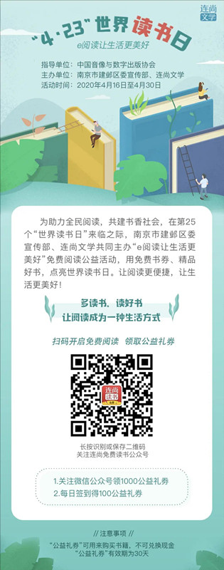 在第25個“世界讀書日”即將來臨之際,由中國音像與數字出版協會指導,江蘇省南京市建鄴區委宣傳部與連尚文學共同主辦的“e閱讀讓生活更美好”免費閱讀公益活動正式啟動,該活動也是“2020年中國數字閱讀云上大會”系列活動之一。