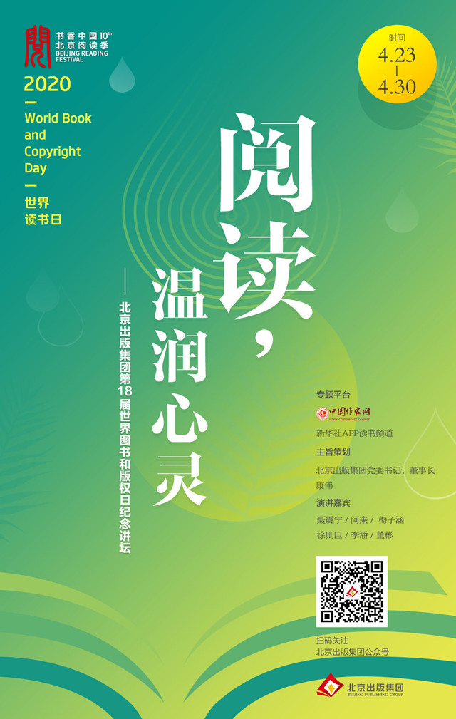 2020年“世界圖書和版權日”,北京出版集團推出“閱讀,溫潤心靈——北京出版集團第18屆世界圖書和版權日紀念講壇”,以閱讀的方式,在文化與科技高度融合發展的5G時代中,履行出版企業的文化使命和責任擔當,廣邀名家學者相約線上閱讀分享,共品書香,共話人生。希望書香里的安靜篤定能傳遞給人們溫暖與力量,驅散陰霾、燭照人心。