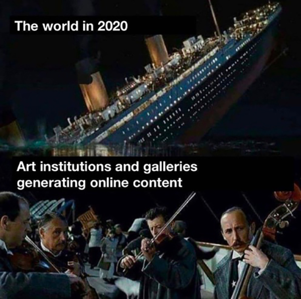 新冠病毒以指數級規模和速度穿越物理邊界的同時,它的次生災難也刺激了社會各界的末日想象。最近在社交媒體上流傳的一個表情包來自《泰坦尼克號》的兩個場景:下沉中的郵輪象征著“2020年的世界”,甲板上演奏的樂隊則代表著“生產線上內容的藝術機構和畫廊”。這個表情包給藝術界敲了一記悶鐘:世界之舟正在沉沒,全球經濟前景岌岌可危,藝術工作者的安全網和社會身份難以獨善其身,難道繼續生產僅僅是為了維系一種歸屬感?藝術工作者會不會成為這些內容的唯一觀眾?