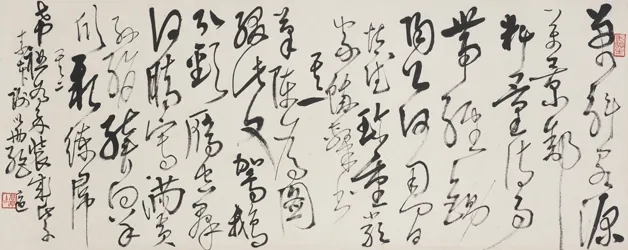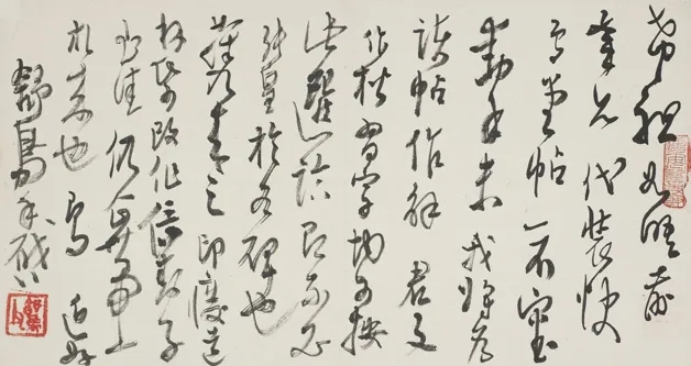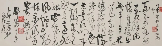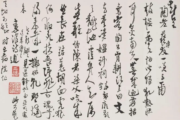 靜靜凝視高二適的書法遺墨,那靈異的墨線,似高猿悲叫,亂水潛奔,這是流淌在古典詩文和經典碑帖中的心靈對晤,是意與古會的神異契合。在筆力彌滿、意態天矯,行氣淋漓的筆勢中透映出一位傳統文人的自我風神。從“赴速急就稱奇觚,鬼哭神驚運思初”的詩句里,流露出他作書時“筆所未到氣已吐”的豪邁心象。高二適的書法意象以氣勢開張、書蘊“詩意”為基調,以其精湛的筆墨古法、深厚淵深的文史修養和特立高潔的文人風骨幻化熔鑄,開古典主義之新境,堪稱傳統書法草書一脈的浪漫主義大師。