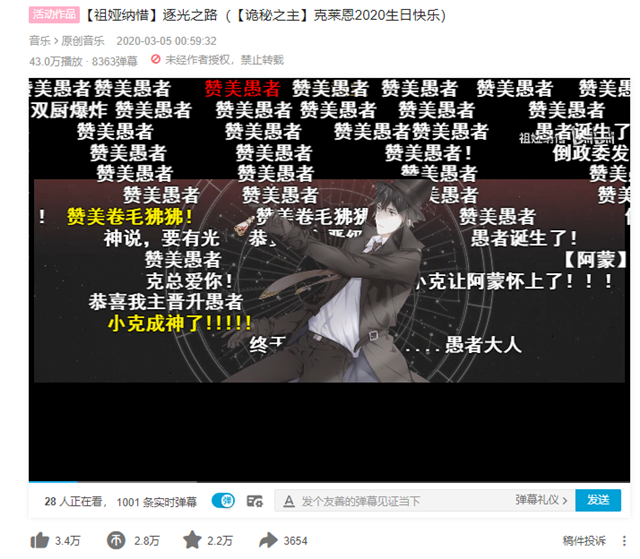 此外,粉絲還為主角克萊恩慶生制作了同人歌曲,該作品在B站獲得43萬點擊、8000多條彈幕評論。B站內《詭秘之主》的粉絲自制相關視頻數量高達1000多個,專欄數量有140余個。