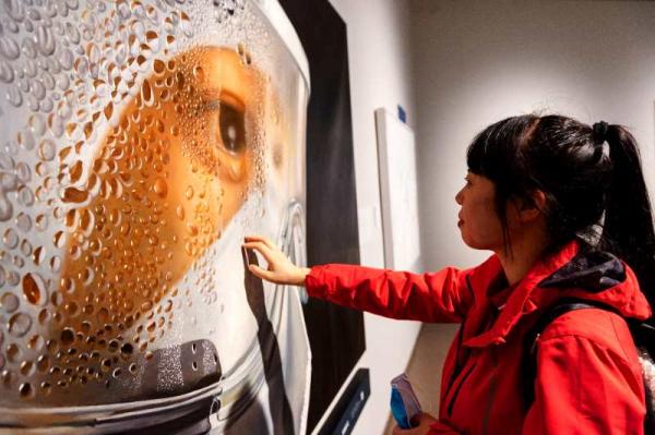 4月28日,畫中人貴州援鄂的護士長龍艷在中華藝術宮撫摸作品《抗疫天使——2020年2月9日,武漢,晴》中的自己