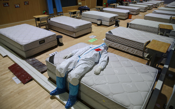 賴鑫琳,《如釋重負》(3月9日晚,武昌方艙醫院。湖北省人民醫院江文洋醫生在結束了自己在方艙的最后一個夜班后躺在空床上,如釋重負)