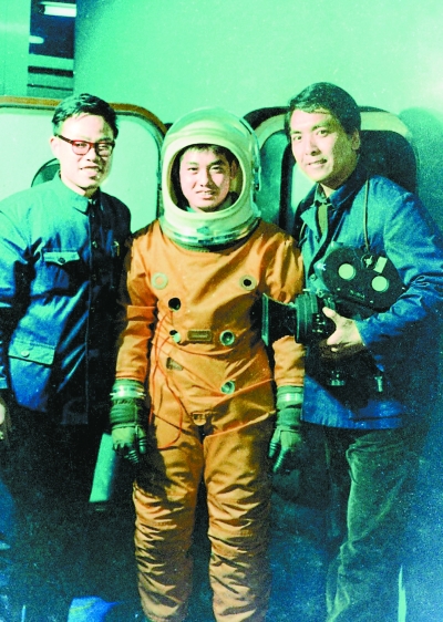 1979年在拍攝電影《載人航天》時進入航天基地,葉永烈(左)與宇航員合影。