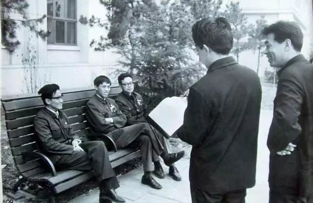 1978年,畫家陳逸飛(中間站立者)為宗福先(左一)、盧新華(左二)、葉永烈(左三)畫速描