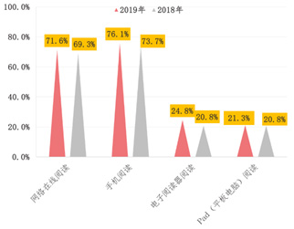 4月20日,中國新聞出版研究院在線發布“第十七次全國國民閱讀調查”。調查發現,2019年我國成年國民包括書報刊和數字出版物在內的各種媒介的綜合閱讀率為81.1%,較2018年的80.8%提升了0.3個百分點。其中,數字化閱讀方式(網絡在線閱讀、手機閱讀、電子閱讀器閱讀、Pad閱讀等)的接觸率為79.3%,較2018年的76.2%上升了3.1個百分點。
