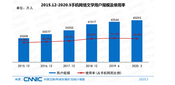2015.12-2020.3手機網絡文學用戶規模及使用率