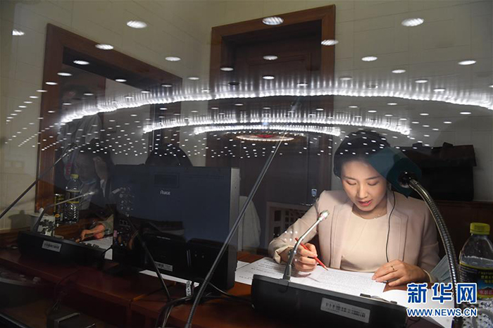 5月25日,十三屆全國人大三次會議在北京人民大會堂舉行第二次全體會議。這是工作人員在現場進行少數民族語言同聲傳譯。 新華社記者 金良快 攝