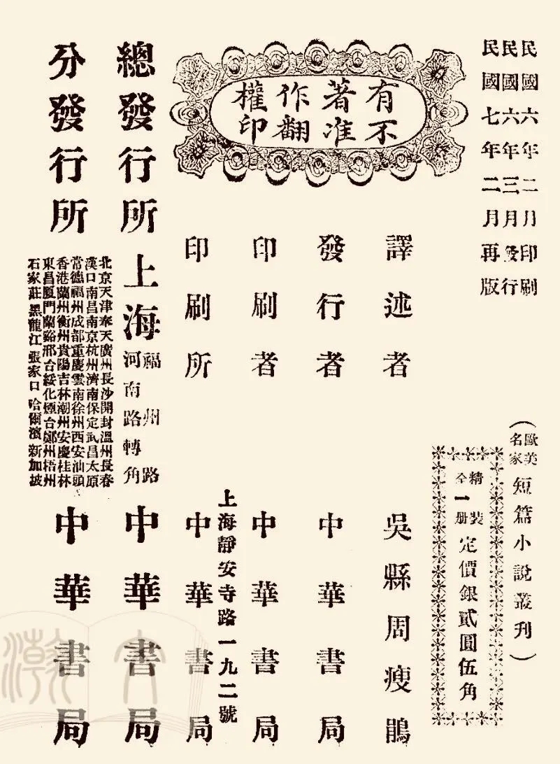 周痩鵑在《我翻譯西方名家短篇小說的回憶》一文中說:“二十二歲時,為了籌措一筆結婚的費用,就把這些年來譯成的西方各國名家短篇小說匯集攏來,又補充了好多篇,共得十四個國家的五十篇作品,定名為‘歐美名家短篇小說叢刻’?!敃r中華書局當局似乎還重視我這部‘歐美名家短篇小說叢刻’,一九一七年二月初版,先出平裝本(三冊),后又出精裝本(一冊),我自己收藏著的,就是這樣一冊精裝本。只因經過了四十年,書脊上的隸書金字,已淡至欲無,而淺綠色的布面也著了潮,變了色了?!雹菰撐娜翁峒皶?,均稱《叢刻》,且將初版時間記為1917年2月,筆者認為這可能是初版時間為二月之說的來源。