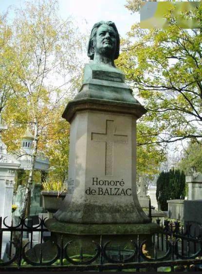 巴爾扎克的墓比較好找,因為有明顯的引導圖。在幽靜的林中小道路邊,綠色叢林中一尊 “ 大頭 ” 像映在面前,是我們熟知的蓬亂長發和略帶疑惑的目光,一眼認出這就是巴爾扎克。巴爾扎克的墓地比起周邊一些名人的墓比較簡樸,簡潔的銘文鐫刻在他半身雕像的臺座上:這里長眠著巴爾扎克和與他一起合葬的兩個女人。同去的法國朋友給我們解釋:一個是巴爾扎克終生愛戀的女人,他等了這女人 21年,因為她有丈夫。丈夫死后,女人與他結婚,婚后一年,巴爾扎克離世,另一女人,是他這位妻子與前夫所生的女兒。