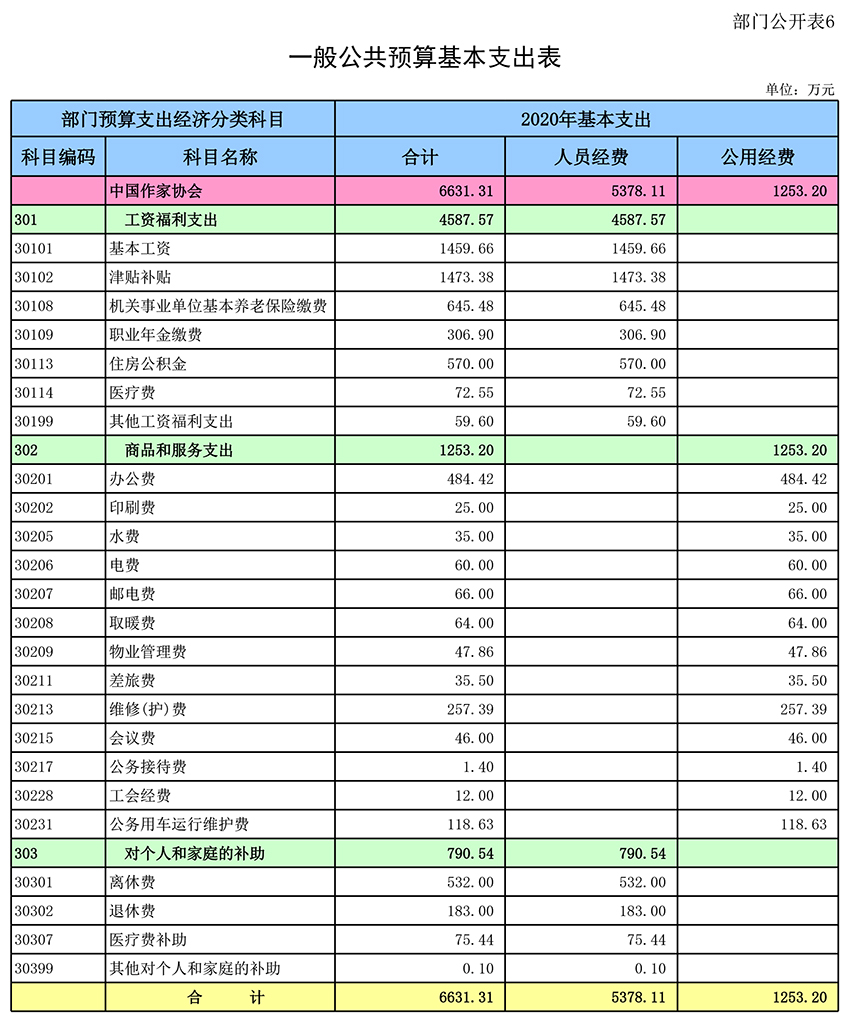 中國作家協會2020年一般公共預算基本支出6631.31萬元,其中: