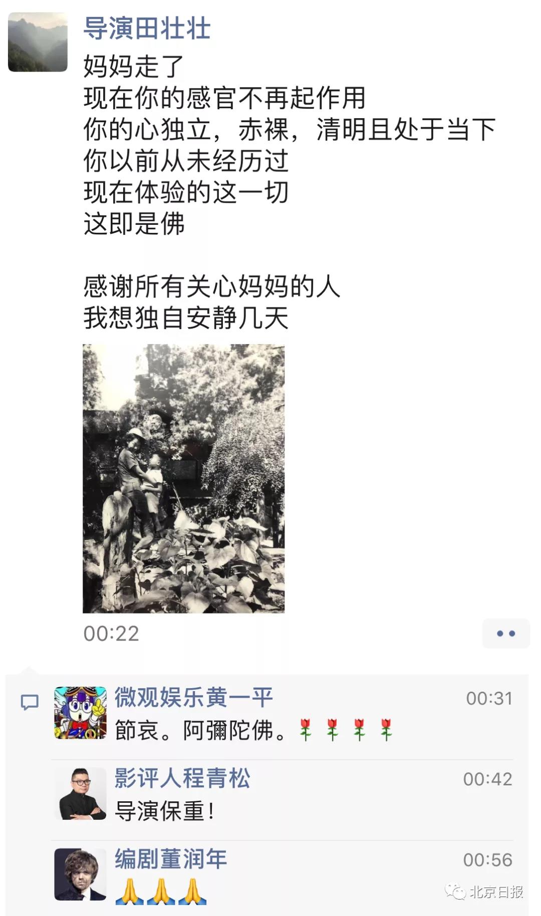 田壯壯導演在朋友圈寫道:感謝所有關心媽媽的人,我想獨自安靜幾天。
