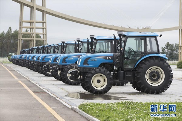 在北大荒精準農業農機中心廣場上展示的大型農機(6月15日攝)。新華社發(張濤 攝)