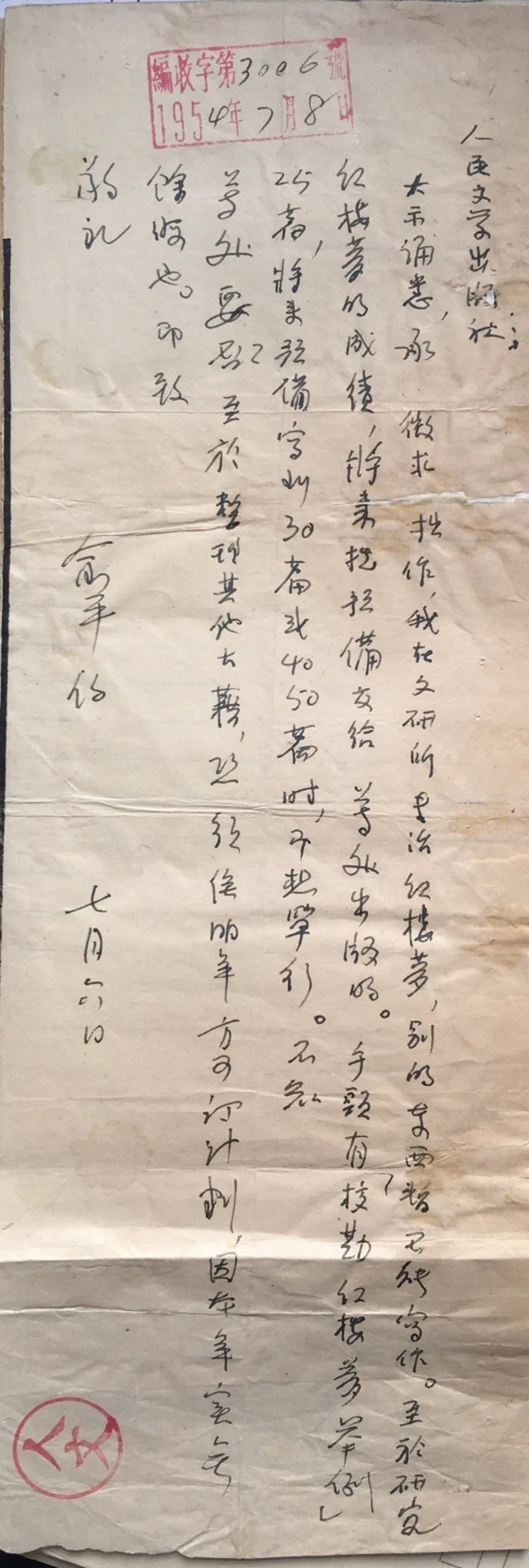 俞平伯先生整理《紅樓夢八十回校本》時期與人文社信件
