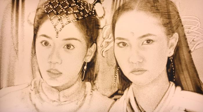 沙畫重現蘇有朋版《倚天屠龍記》中的趙敏和周芷若。受訪者供圖