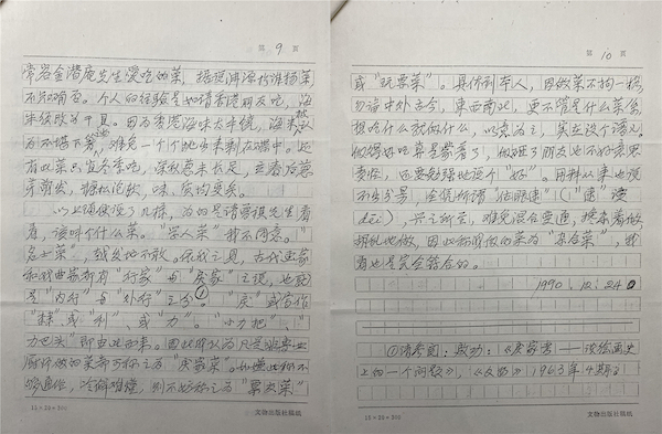 暢安老隨即對答一文,名曰《答汪曾祺先生》,原載于《中國烹飪》1991年第四期,后收入自選集《錦灰堆》。文中,暢安老對汪先生提到的“騎自行車馱圓桌面”的傳聞之誤,“一捆蔥做了一個菜,把所有菜都壓了下去”的言過其實分別做了澄清,謙遜地表明自己“才疏學淺”,絕不敢廁身學人之林,隨即自信地“隨便說上幾樣”自己招待朋友做的七道“雜合菜”,可謂妙語連珠。不知此番對答是否加深了兩位老饕的感情,多年后兩人交往頻繁,還共同成為范用、許以祺發起的“美食人家”的創會會員。此稿完成于1990年12月24日,暢安老寫給孫孚凌的信日期為1991年2月12日,此稿尚未發表,故信札“連同尚未刊出拙作復印一并寄奉”。復印稿雖下原稿一等,但我們畢竟看到了這篇多年后被人們廣為轉發、津津樂道,關注度絕對十萬加的手稿原貌。