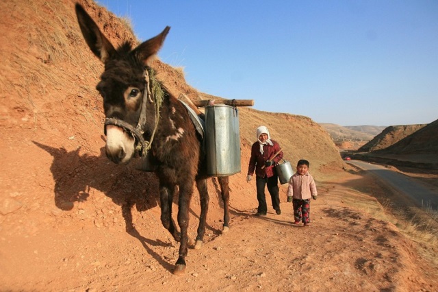 因為極度缺水,西海固人曾經習慣了驢馱水(季正 攝)