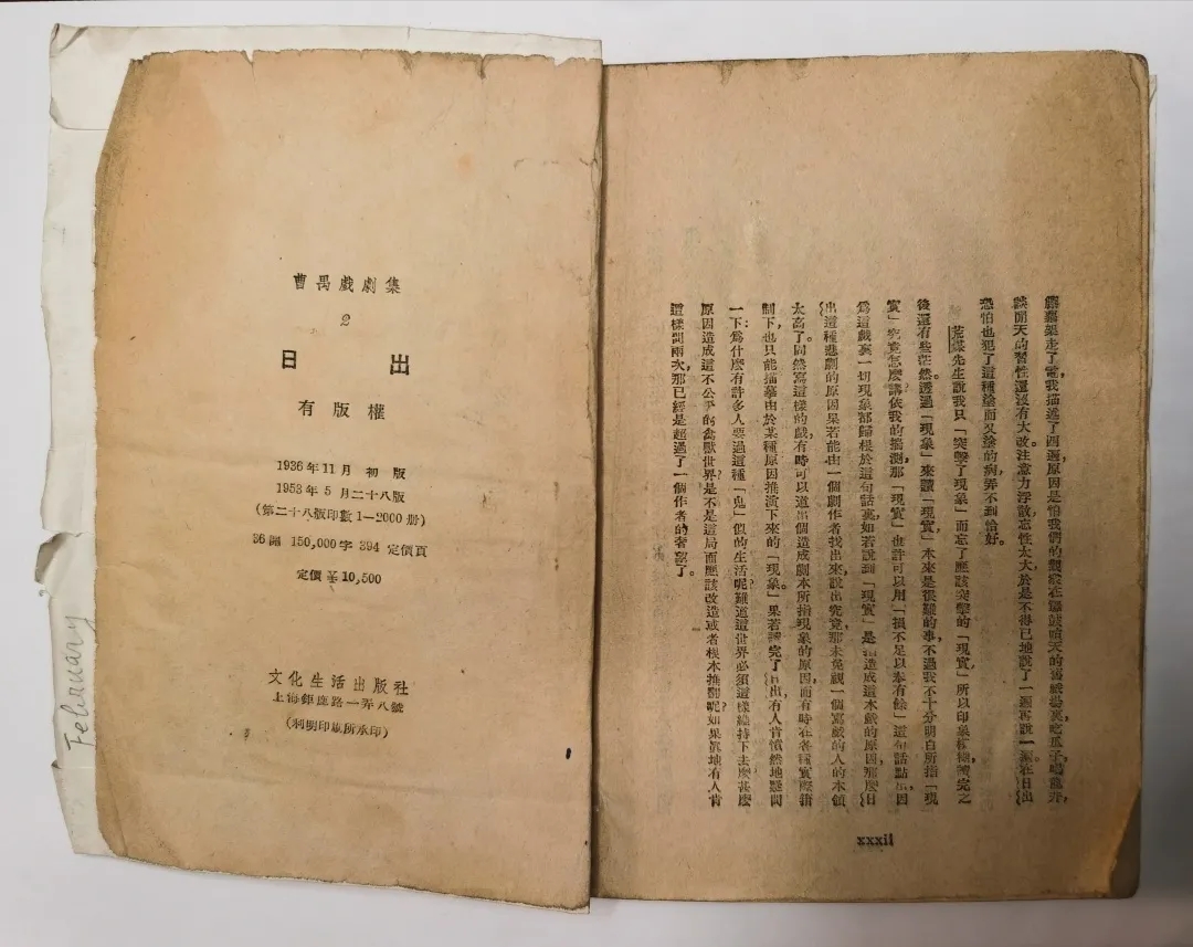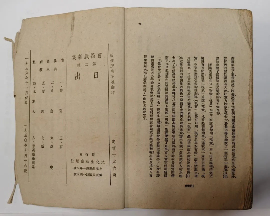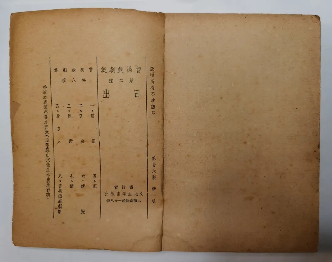 《日出》是曹禺的第二部劇作。因《雷雨》贏得的巨大聲譽,《日出》一經發表便引來文壇的高度關注。1936年6月1日《日出》在上?!段募驹驴穭摽栠B載,每期一幕,連載4期,9月1日刊畢,是為初刊本。兩個月后,1936年11月《日出》單行本由上海文化生活出版社(簡稱文生社)出版,是為初版本,簡稱文生版。文生版《日出》大獲贊譽,版次更迭極快。1936年11月初版,12月即“再版”,至1937年7月,10個月的時間里,文生版《日出》共出版了11個版次,印刷14000冊??箲鹌陂g,與其他現代產業一樣,新文學出版業遭受重創,文生版《日出》的版次更迭雖然減慢,但8年時間仍然出版了約11個版次??箲饎倮?,文生版《日出》仍然廣受歡迎。至1953年5月,文化生活版《日出》總共出版了至少28個版次,可謂長銷不衰。