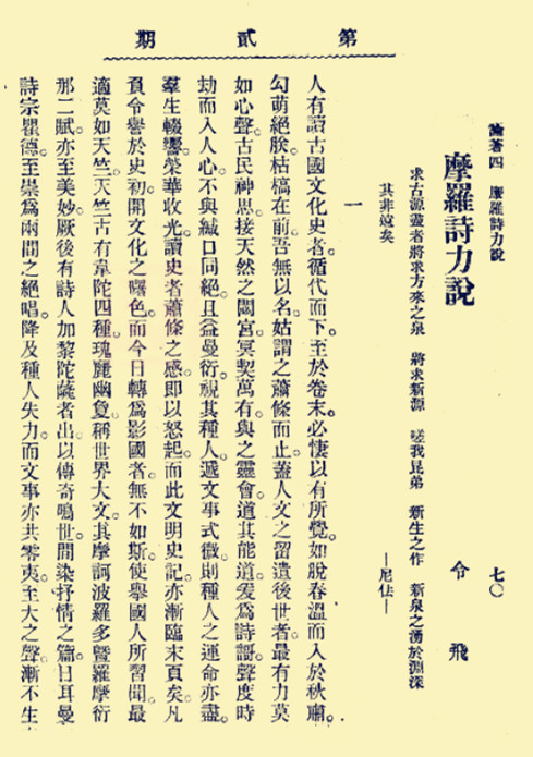 發表于《河南》雜志1908年第2期的《摩羅詩力說》,署名令飛